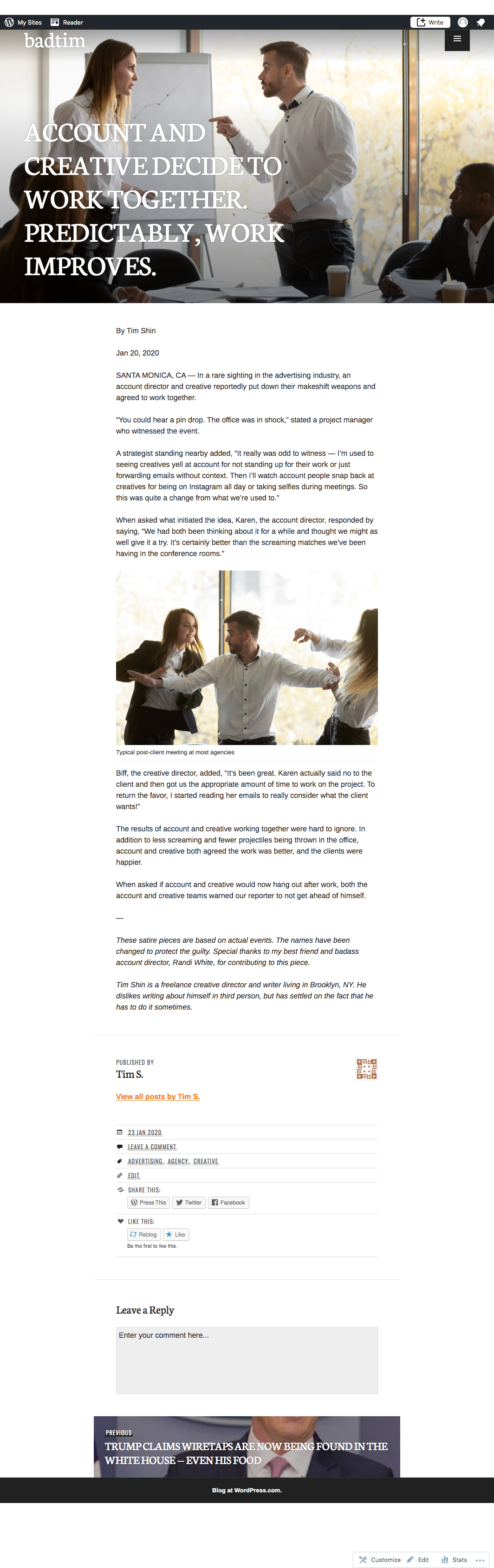 I write a satire blog in my spare time. Because let's face it, there are just too many situations that beg for it. Here are a couple of pieces I've written. If you'd like to see more, just ask and I'll send them your way.